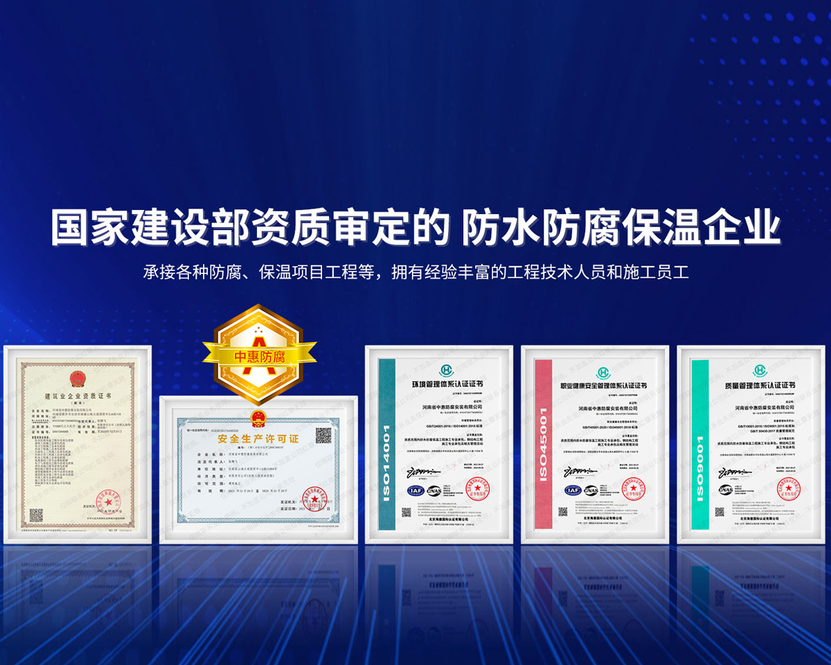 公司經營范圍:防水防腐保溫工程;消防設施工程;建筑裝修裝飾工程;建筑機電安裝工程;電力工程;建筑工程;石油化工工程;工業清洗工程;油罐清洗工程;鋼結構工程;環保工程;模板腳手架工程;電纜防火封堵、防污閃噴涂、外墻外保溫工程;各類施工勞務作業;設備維修、船舶鉚焊、涂裝;電力工程材料、建材、防水材料、防火材料、防腐保溫材料銷售,并相繼通過了GB/T19001-2008idtISO9001:2008GB/T50430-2007質量管理體系認證證書。GB/T24001-2004idtISO14001:2004環境管理體系認證證書。GB/T28001-2011idtOHSAS18001:2007職業健康安全管理體系認證證書。公司是中國防腐蝕于防護協會、中國施工企業管理協會、電力協會和中國鋼結構防水協會會員單位。 公司的經營業務涵蓋了石油、化工、電力、冶金、煤炭、船舶、國防、燃氣、水利、環保、交通運輸、航空及國防軍工和輕紡市政等行業的防腐保溫絕熱設備。鋼結構安裝、防火、防水、金屬噴鍍、聚脲噴繪、陰極保護、防滲透堵漏、玻璃鋼及各種磚版材料襯里、橡膠襯里、煙氣硫和耐酸溶劑腐蝕等工程施工。公司連續十年榮獲“省市先進施工企業”“安全生產先進單位”“重合同,守信用企業”和“AA***資質企業”的稱號。2000年被命名為市級文明單位,2002年被國家工商行政管理局命名為“重合同,守信用的企業”、被中國工業防腐蝕技術協會命名為“防腐蝕企業,能源節約及環境保護領域有豐富的經驗和***的業績。工程一次交驗合格率100%。其中攀枝花鋼鐵公司煉鐵廠四號高爐及熱風爐防腐工程、上海寶鋼公司煤氣柜防腐工程、撫順石油一廠裝置防腐項目、齊魯石化公司稀烴廠高塔防腐工程、吉林化學工業公司煉油廠油罐防腐工程、天津石化熱電廠六號爐頂棚聯絡管保溫工程、大慶油田(太倉)力神泵業工程、中國化學工程第十一建設工程、中原油田勘探局工程、中國石化銷售有限公司華北分部、魯皖輸油管道工程、貴州開磷息烽合成氨工程、陜西黃陵煤化工程、中國石油天然氣西部管道塔里木輸油工程、邯鋼集團邯寶鋼鐵公司煉鐵工程、德州供電工程、吉寶(南通)船廠工程,偃師華潤熱力工程、鄭州熱力總公司。 河南省中惠防腐安裝有限公司愿以豐富的施工經驗,***的技術,***的設備,***的管理,***的服務,竭誠為國內外廣大的用戶提供***滿意、******的工程作品?! ∥夜驹概c國內外同仁一道,團結協作,共同推進防腐蝕行業發展! 公司地址:河南省長垣縣建設路北段360號 固定電話:0373-8866488 郵編:453400 網址:http://www_zhff_com_cn.sjzrcz.com
